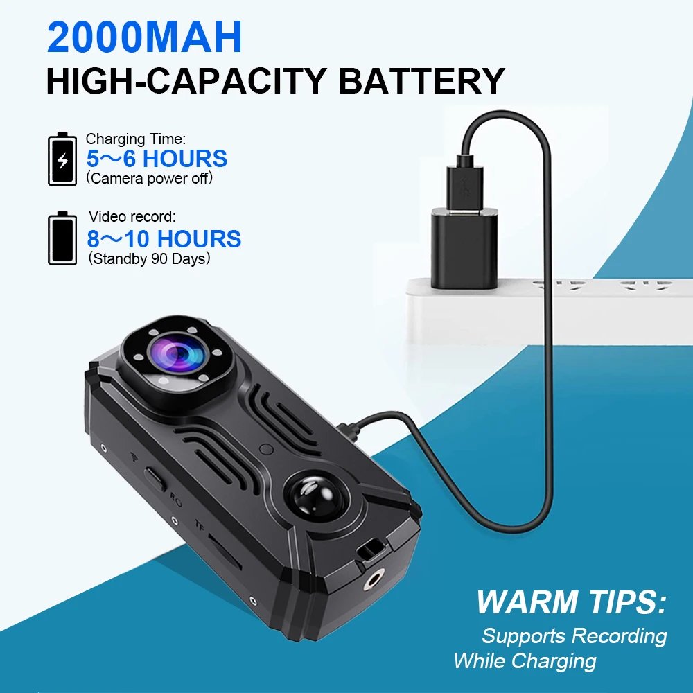 2. PIR Mode, Builded-in 2000mah battery, it can enter into sleep mode. So, support standby time:90 days,and the battery can support recording time:8-9 hours.